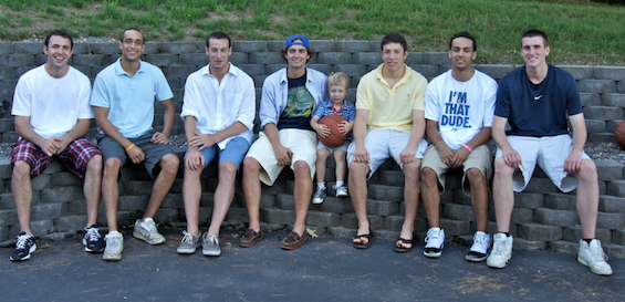 I would not have expected 20-year-old basketball players to have time for a four-year-old on the sidelines, but they actually seem to appreciate his dedication and let him be a part of things in his own small way. They give him high fives on their way onto the court and talk to him after games. He got to cut down a piece of the net after a championship win. This weekend, the kind and generous Wholeys invited us to a graduation party for Ryan Wholey (#33, Pelham, N.H.) and John got to play ball with a bunch of the players and get autographs. He was in heaven.