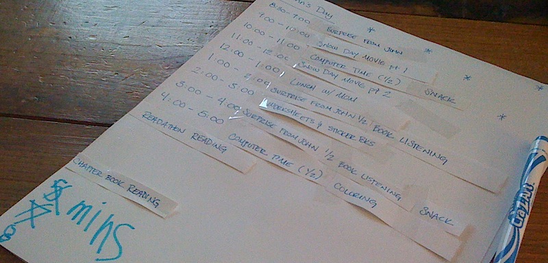 Now John and I are here for the day and I have a ton of work to do. John would happily entertain himself by playing on the computer all day, but then I would feel even more guilty about working than I usually do. In an earnest effort to make sure he has a nice day AND I get my proposal written at work, we collaborated on the schedule above. I wrote down everything I could think of that John could do during the day (without too much help from me) and John arranged them on the schedule. It kicks in at 8:30. I hope this works!